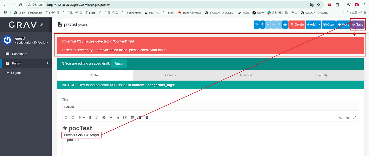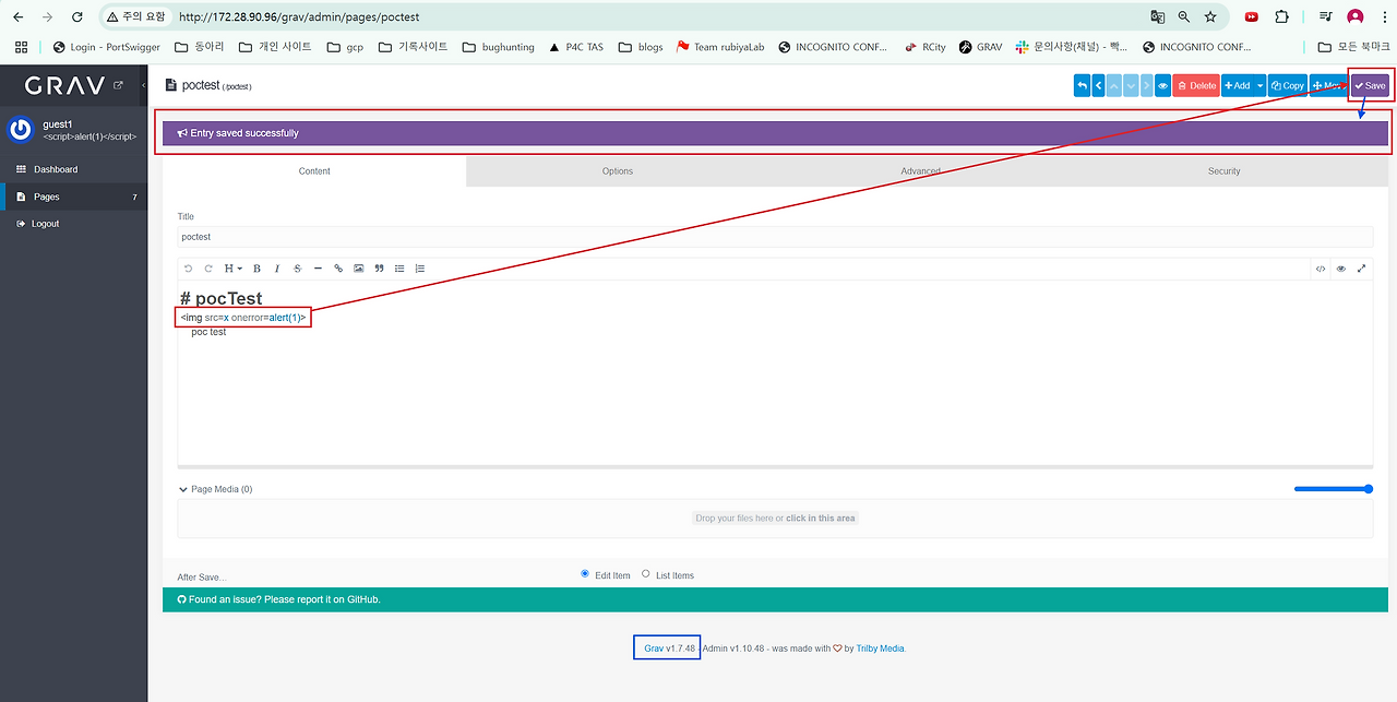 Cross Site Scripting vulnerability in grav v.1.7.48, v.1.7.47 and v.1.7.46 allows an attacker to execute arbitrary code via the onerror attribute of the img element
