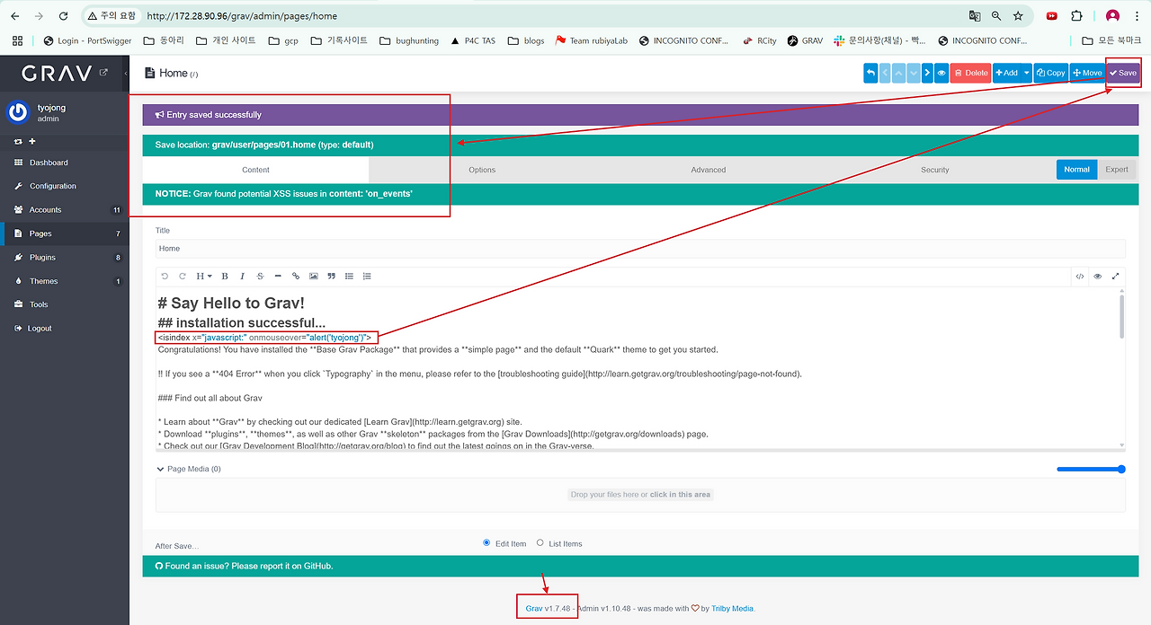 Cross Site Scripting vulnerability in grav v.1.7.48 and before allows an attacker to execute arbitrary code via a crafted script to the form fields