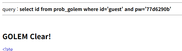 if(($result['pw']) && ($result['pw'] == $_GET['pw'])) solve("golem");