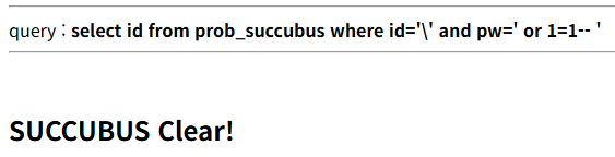 select id from prob_succubus where id='\' and pw=' or 1=1-- '