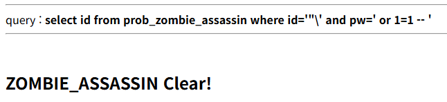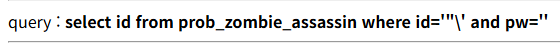 $query = "select id from prob_zombie_assassin where id='{$_GET[id]}' and pw='{$_GET[pw]}'";