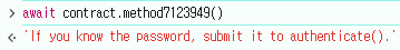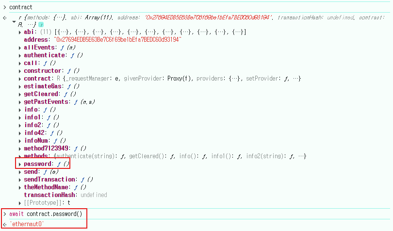 contract를 입력하니 password라는 메소드가 있어 실행해보니 password의 문자열이 출력되었다.