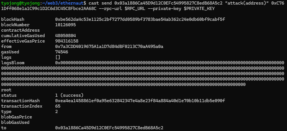 때문에 문제에서는 이를 방지하기 위해 이전 트랜잭션에서 사용한 블록 해시와 현재 트랜잭션의 블록 해시를 비교해 일치하면 revert시켜 모두 다른 트랜잭션에서 시도하도록 만들었다.