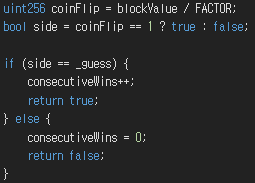 interface를 통해 CoinFlip컨트랙트의 flip함수를 가져오고 블록해시값과 FACTOR값을 통해 계산한 참/거짓 값을 flip함수 인자로 넣어 호출한다.