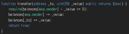 보내는 토큰은 잔액보다 많지 않아야 하고 _value값 만큼 사용자의 잔액에서 차감되며 _to의 잔액이 증가한다.